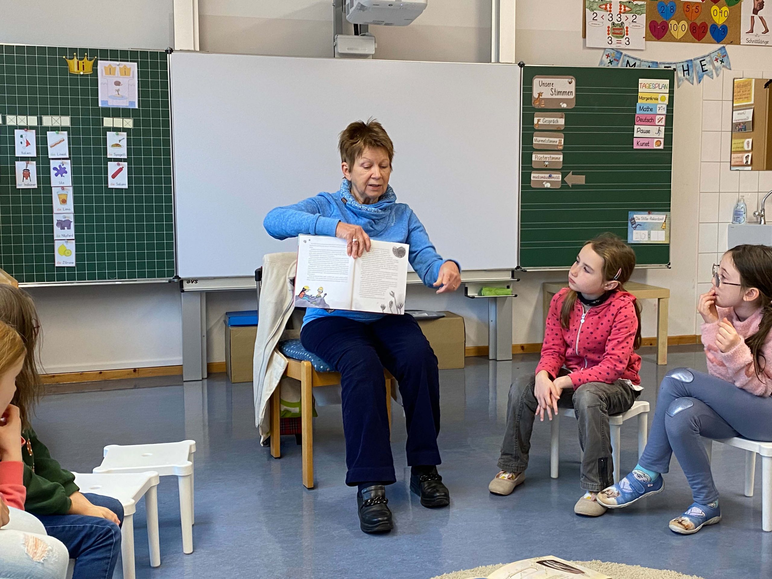 Der Klasse 1/2a stellte Frau Hebig die Geschichte „Reise ins Erdmittelalter“ aus dem Buch „Erde – Geschichten zum Graben und Entdecken“ von Susanne Orosz vor.
