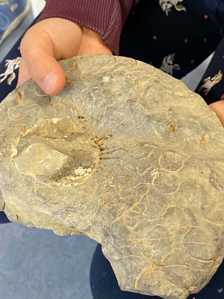 Überaus beeindruckt war die Klasse von den teils selbst gefundenen Fossilien, die Frau Hebig zur Anschauung mitgebracht hatte und die alle Kinder unbedingt genauer betrachten wollten. Sicherlich geht der eine oder andere nun mit offenen Augen durch Retzstadts Natur, denn auch hier sind kleine „Schätze“ aus der Urzeit durchaus zu finden. Am Ende gab es sogar noch ein kleines Buchgeschenk für die Kinder, wofür wir uns alle ganz herzlich nochmals bei Frau Hebig bedanken.